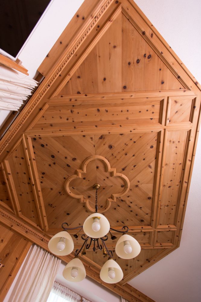 Liebevoll dekorierte Stube in Zirbe massiv mit Kassettendecke über dem Sitzbereich