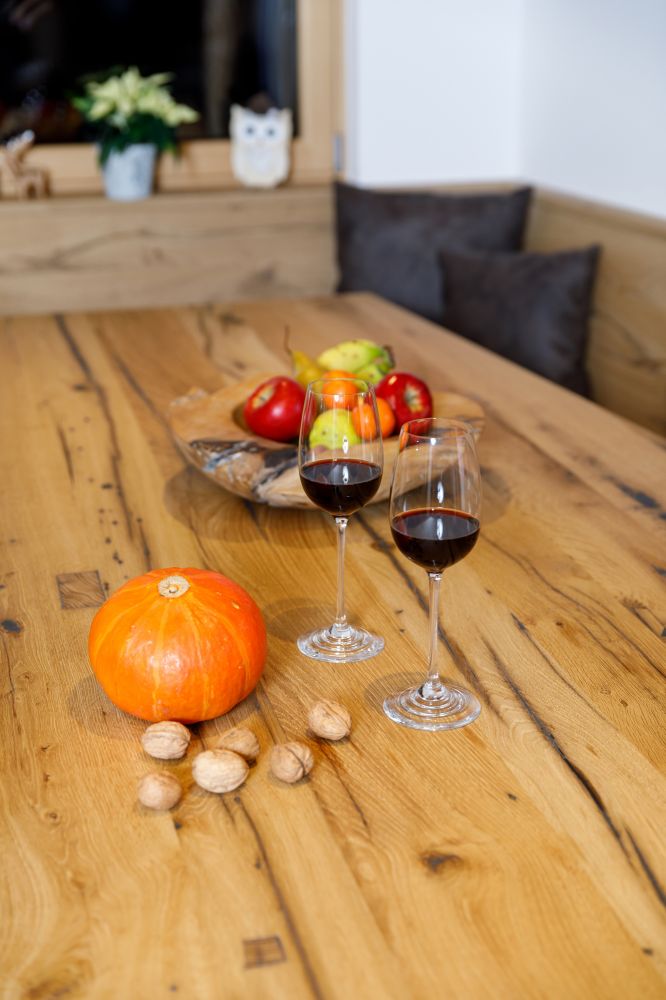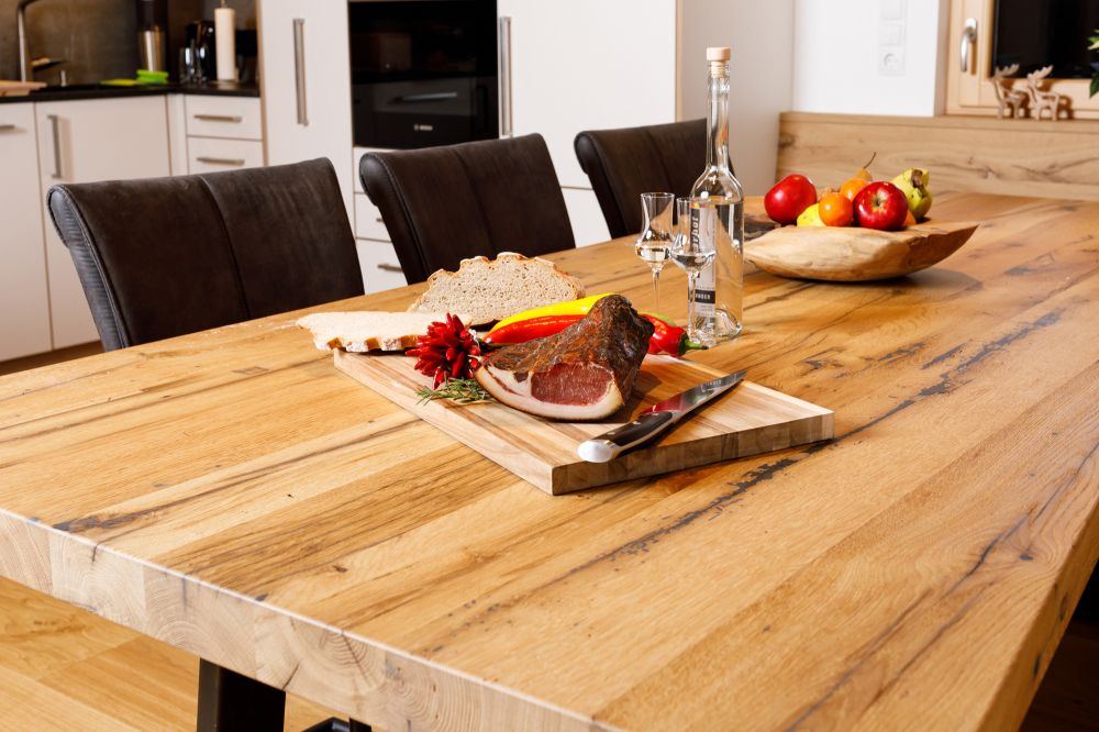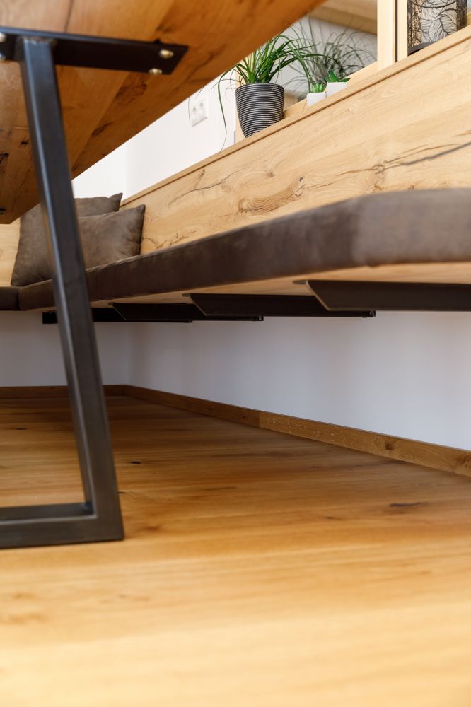 Eckbank in Altholzeiche – bodenfrei „schwebend montiert“. Schwere Tischplatte gefertigt aus altem Gebälk – Tischgestell – Schwarzstahl. Um die natürliche Oberfläche des Holzes zu unterstützen, wurde mit Natureffektlack überlackiert.